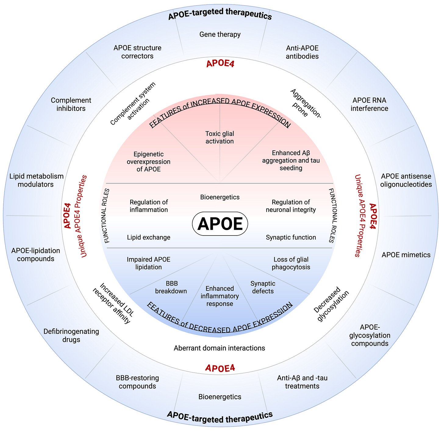 At the center are APOE’s essential physiological functions—lipid exchange, inflammatory regulation, synaptic maintenance, bioenergetics, and neuronal integrity. Surrounding this core, the diagram depicts how APOE4 disrupts these processes through both excessive and insufficient APOE activity: toxic glial activation, impaired lipidation, complement overactivation, enhanced amyloid and tau aggregation, and breakdown of the blood–brain barrier. The outer ring aligns specific therapeutic strategies with each dysfunction, illustrating how APOE4’s diverse molecular effects require equally diverse intervention points. The figure thus serves as a conceptual roadmap for developing APOE4-targeted therapies grounded in mechanistic insight.
