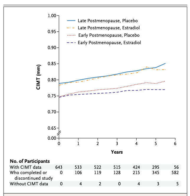 Mean carotid intima–media thickness (CIMT) as a measure of atherosclerosis measured over six years in women randomized to oral estradiol or placebo, stratified by time since menopause. In women in early postmenopause (<6 years since menopause), estradiol significantly slowed the progression of CIMT compared with placebo. In women in late postmenopause (≥10 years since menopause), estradiol did not reduce CIMT progression compared with placebo. These findings support the timing hypothesis, suggesting that the vascular effects of estrogen depend on when therapy is initiated relative to menopause. Data adapted from the Early vs Late Intervention Trial with Estradiol (ELITE)