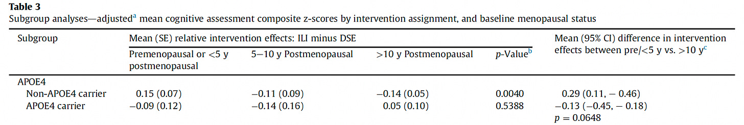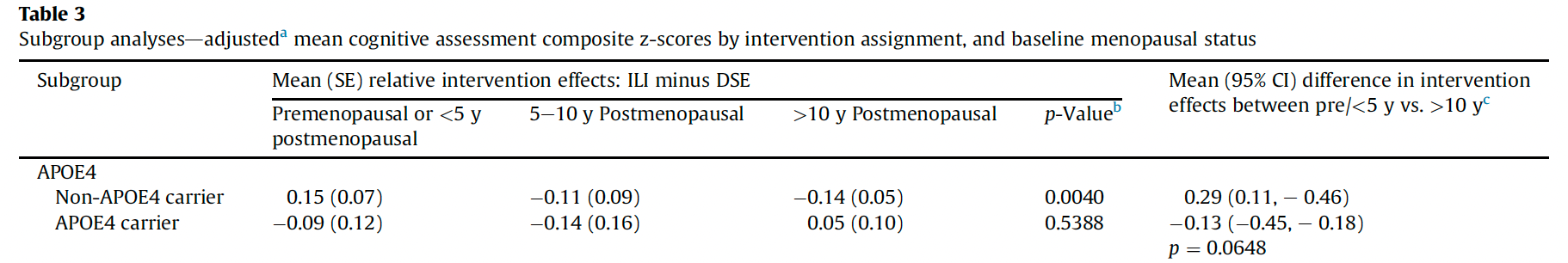 In APOE4 carriers—especially women—fat loss is consistently associated with faster cognitive decline, not improvement. Figure 2 below shows APOE4 women did not have any benefits from an intensive weight loss intervention on cognitive functions in a subanalysis of the Look AHEAD trial.