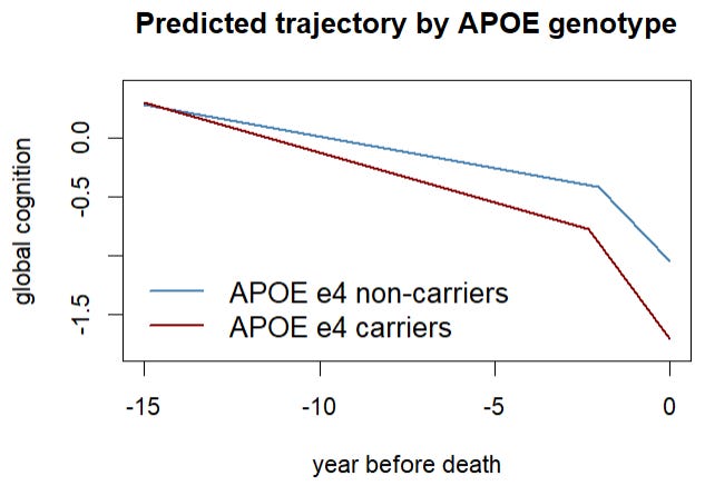 Once the faster phase begins, APOE ε4 carriers also tend to decline more quickly than non-carriers in those last years. So the steep part of the slope is steeper.