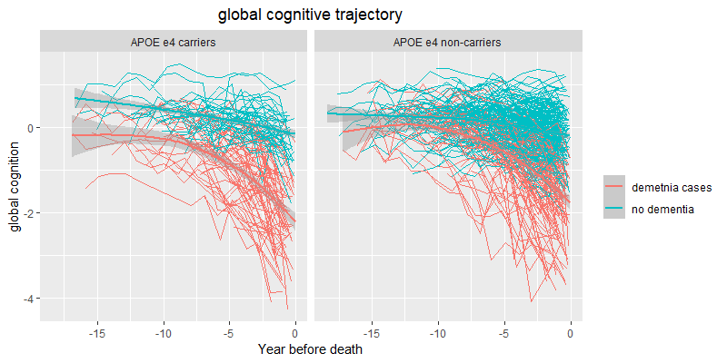 I start this post with a well-characterized study population, because it provides informative data on how APOE ε4 affects cognitive functions.