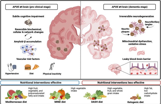 This helps explain why nutrition trials often show limited effects in older APOE ε4 carriers—and why this shouldn’t be interpreted as evidence that nutrition doesn’t matter for them. Rather, it underscores the importance of starting earlier.